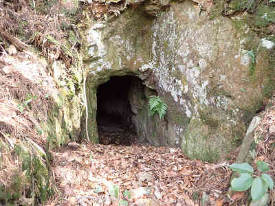ヘッドライトをつけて中に入るが、とても暗い。奥へ向かって行くと右にも分岐が有り、更に奥へ向かって横穴が続いていた。クマはいないだろうが、単独行なので途中で引き返した。これは主康鉱山跡で、周防大島に鉱山があったのには驚いた。元の道まで引き返し更に坂を下る。