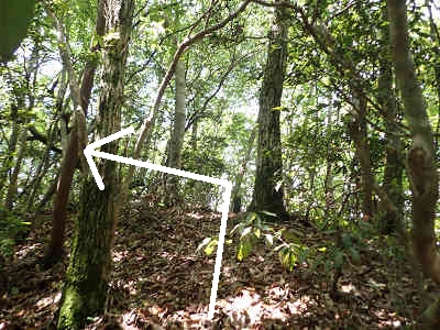 祠を出発、進路を北にとり高度を上げるがすぐに直登のような状態になったので進路を少し右へ振り、山腹につけられた細い道へ向かう。この途中に再度朽ちた目印を見つけたので、みんな考えることは同じなんだと安心した。