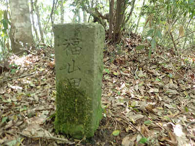 そのまま進むと植林帯に出たので歩きやすい道をとり尾根へ着いた。なんとこの入口にも目印を確認、安心して尾根道を西へ進む。尾根道に着けば一安心で、倒木で歩き難くなった場所を通過、少しずつ高度を上げれば「福山界」と彫られた石杭の場所を左折、一旦下って登り返せば二等三角点の置かれた猿ヶ山の山頂に着いた。