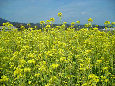菜の花と華山 県道65号を南下し、旧美祢サーキットを過ぎた先で右折して県道233号入る。県道233号に入り1.8km程度進んだ先の交差点を左折し、中岳地区に向かう。500m程度南方向に進むと正面に防火用水のある分岐を見るので、分岐の100m程度手前の道路脇に車を置いて出発する。