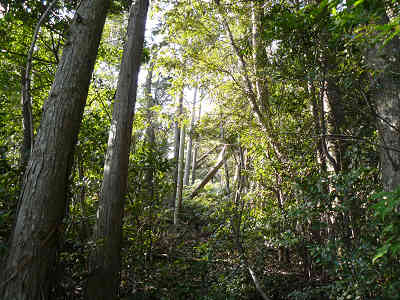 炭焼き跡を通って奥へ向かい、わずかな踏み跡のように見える場所から高度を上げる。するとやはり前方にシダが見えてきた。普段はシダを迂回してきたが、今日ばかりは逃げるわけには行かない。頭上を植林が覆っているため、シダの勢いは弱いみたいだ。背の低いシダをしっかり踏みしめながら足場を確保。少しずつ高度を上げれば、無事シダの藪を通過した。