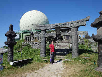背後に背振山レーダー気象観測基地、正面に背振山に建つ航空自衛隊レーダー基地を眺めながら歩を進めていると、車止めが現れる。そのまま県道を横切り山道に入るが、右側には佐賀県神埼市の案内が立っていた。もう山頂までは500m、笹原につけられた木橋を渡ると広場に着く。広場からは最短距離を採り、階段を登ると正面には航空自衛隊背振山分屯基地が見えてきた。