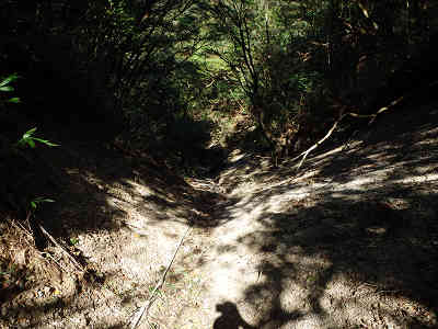 足下の崩落しそうな箇所に立つ椎原峠ルートP−7標識を過ごすと沢沿いの道となり、大岩の目立つ場所を過ごす。苔むす岩場に渡されたロープを補助に進むと、懐かしい炭焼き窯跡の石組みを過ごす。