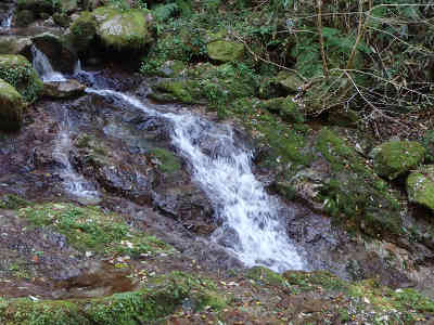 沢沿いにつけられた道を進み、美しい小滝などを眺めながら少しずつ高度を上げる。やがて椎原峠ルートP−2を通過、岩場を過ごし沢を渡る。シダの目立つ植林帯の下を進むが、この苔むした風景が素晴らしい。間もなく椎原峠ルートP−3を通過、少し進むと植林帯が終わり伐採地に出る。