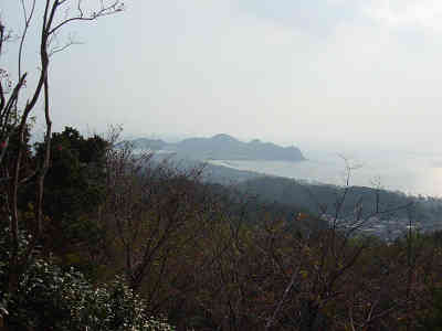 道は林道の面影を残しており広く整備されている。やはり台風の名残で松が倒れていた。緩やかな坂を登ること5分程度で千坊山山頂に到着した。展望は象鼻ヶ崎から右側方面が開けている。今日は霞んでいるため墨絵のような風景だったが晴れていたら海の中に鮮やかな峨眉山がくっきりと浮かんでいることと思われる。