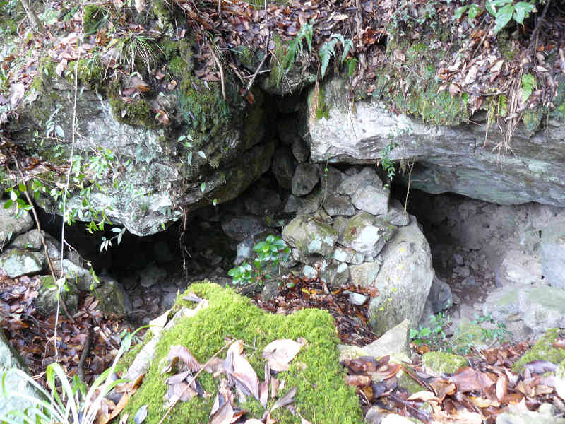 山門まで戻り、右手の石仏の切れた場所より右方向へ入る。すぐに岩の多い谷に着き、この大岩群が仙岩寺の名前の由来と関係あるのかと思ってしまう。まずは尾根に向かうため、この谷を直登する。すぐに炭焼き跡を通過し、更に上へ上へと急な斜面を登る。