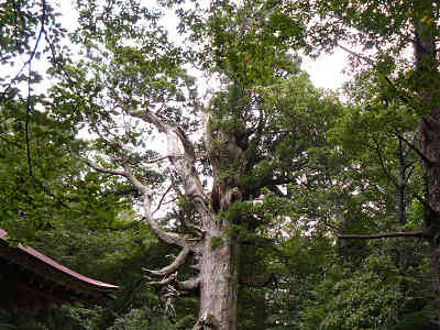 船上神社に参拝し、奥宮へ向かって船上神社の右手に進むと樹高23m、周囲(地上1.5m)5.6mの杉の大木が立っている。この木は船上神社のご神木だろうか、大きな木を眺めた後、神社から180m先に立つ奥の院へ向かう。