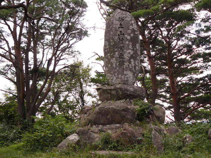 ススキの原を左方向に進むと頂上小屋が建っており、その先には船上山行宮之碑が立っている。この石碑から南方面に下って行くと千丈のぞきと呼ばれる絶壁を見下ろす場所が待っているのだが、千丈のぞきは後に回すことにし、まずは船上山山頂を踏むことにした。船上山山頂といってもすぐ目の前であり、緑色の説明板の立つ付近が船上山615mの山頂であることは説明板の地図を見て初めて納得することになった。