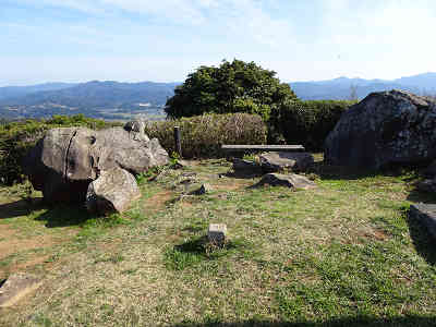 足下が草原からタイル状の歩道に変わり、右にトイレを過ごす。この先で階段をわずかに登れば千畳敷の三角点が置かれていた。駐車場から高低差なしの到着である。