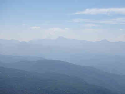 至仏山山頂 南東には日光白根山がそびえ、その左には平坦な山容の男体山が顔を出している。北東の尾瀬ヶ原の先に燧ヶ岳がそびえ、その左奥には会津駒ヶ岳が霞みながらも存在感を示し、北に平ヶ岳、その左には雲の間から越後駒ヶ岳が顔を見せている。 また、南には武尊山、その左に霞みながら赤城山が見えており、更に左には皇海山と続く。美しい展望を肴に紅茶を飲み小休止、山頂で飲む紅茶やコーヒーは、一番のご馳走である。しばらく周囲の展望を眺めた後、下山を開始する。下山は小至仏山等の山頂を踏んで一周回りで鳩待峠を目指す。