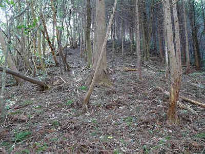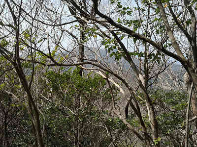 北峰から南峰へ戻り下山を開始した。登山時に合流した地点を通過し、214mピークとの鞍部の笹ヶ峠へ着いた。笹ヶ峠から進路を南にとり植林の下を下る。右上には登山時に歩いた尾根コースが見えている。