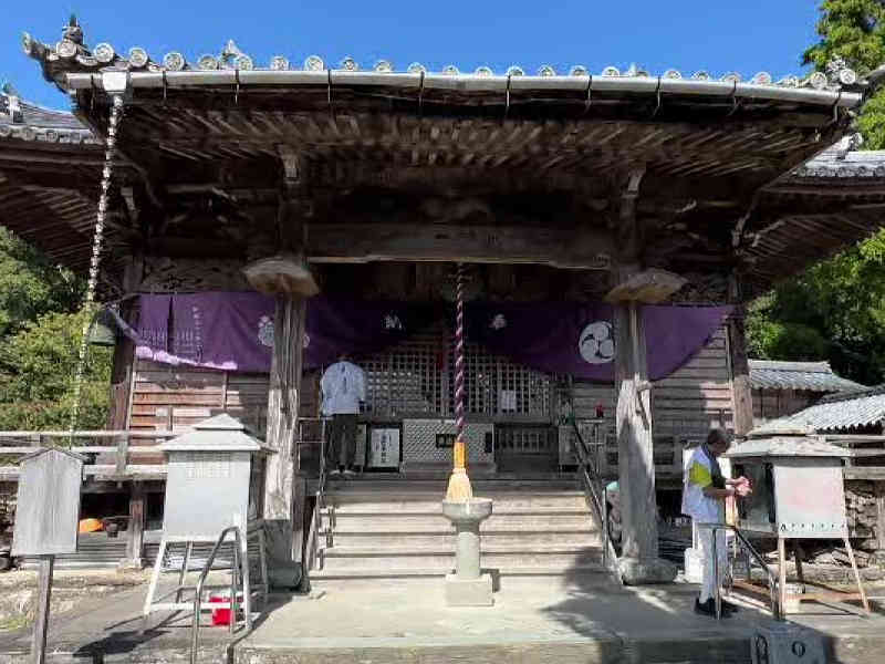四国八十八ヶ所霊場 弘法大師の足跡を訪ねる巡礼の旅 第14番札所の常楽寺へ参拝。4番札所常楽寺は岩盤の露出した寺で、流水岩の庭で有名です。当日は観光バスで霊場巡りをされている大勢の参拝客と出会いました。お坊さんの先導により、般若心経も大きな声で唱えられていました。 境内奧に本堂が建ち、大師堂は本堂の手前右側に建っていました。本堂手前にはアララギの霊木があり、本堂を遮るように立っていました。この霊木は糖尿病や眼病にご利益があるそうです。