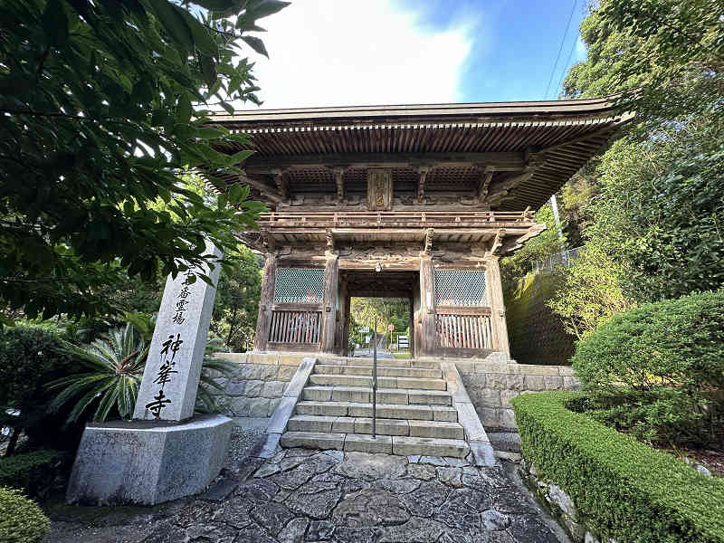 四国八十八ヶ所霊場 弘法大師の足跡を訪ねる巡礼の旅 第27番札所の神峯寺へ参拝。駐車場を出発、仁王門を潜り鋪装道を進んで門柱を通過します。右に鐘楼を過ごせば階段に取り付きます。階段の左には美しい日本庭園を眺めることができました。 赤く塗られた手摺りに助けられ、階段を登り切れば本堂に着きました。本堂に参拝の後、大師堂に参拝しました。