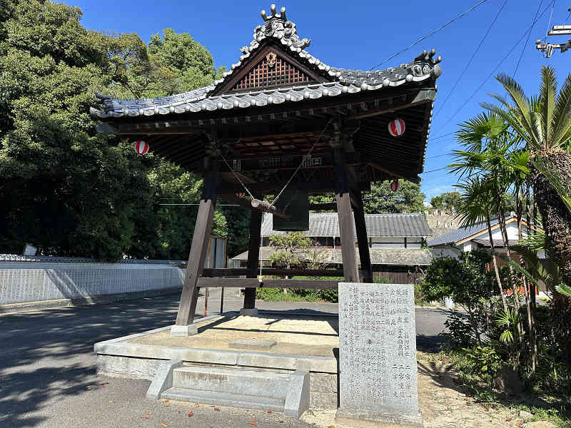 四国八十八ヶ所霊場 弘法大師の足跡を訪ねる巡礼の旅 第54番札所の延命寺へ参拝、ご本尊は不動明王です。駐車場手前に建つ仁王門を潜り、その先に建つ山門を潜って境内に入ります。右に手水舎、左に薬師堂を見送り納経所を過ごせば正面に立つ本堂前に着きます。 本堂に参拝後、大師堂に続く階段を登り大師堂に参拝しました。境内に置かれた鐘楼を見学、修行大師に出会いました。重税に苦しむ農民のため、税を軽減することに尽力した縣村庄屋の越智孫兵衛氏の墓も置かれていました。