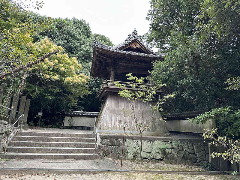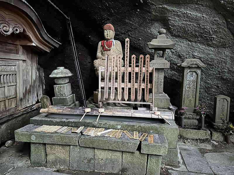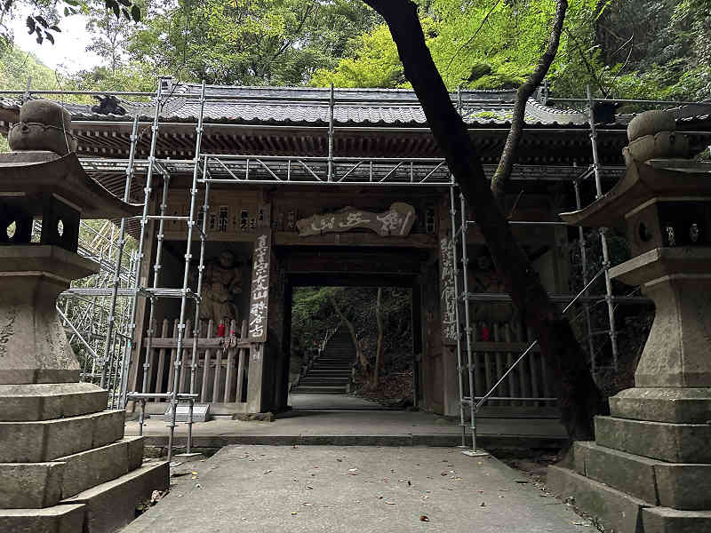 大師堂を出発し、多宝塔、修行大師像、鐘楼堂を見学して階段に取り付き、右に観音堂、左に鐘楼の置かれた十王道を見学し、岩窟の護摩堂の分岐を左折します。