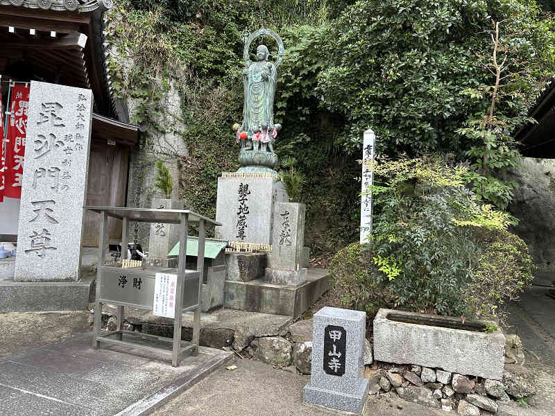 四国八十八ヶ所霊場 弘法大師の足跡を訪ねる巡礼の旅 第74番札所の甲山寺へ参拝、ご本尊は薬師如来です。山門をくぐり境内に入ると、その先には中門が建っていました。中門の先に建つ本堂に参拝し、本堂の左に建つ大師堂に参拝しました。 大師堂を過ごして親子地蔵尊を見学し、その先に建つ毘沙門天尊岩窟に入り毘沙門天に参拝しました。境内では願かけ不動尊、賓頭盧尊者像、淡島大明神などを見学、サルスベリの赤い花が印象的でした。