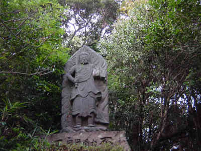 不動明王石像 更に石の鳥居を抜け、荒れた道を進むと四熊子供会建立の四熊ガ岳神社の板碑があり、その奥に二匹の狛犬を従えた四熊ガ岳神社が建っている。神社の奥には海軍省による徳山要港境域標識の碑と山頂三角点も建っており少し賑やかだ。