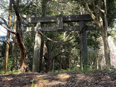 不動明王を過ごし岩の目立つ急登に取り付く。一気に高度を上げていると右に三の鳥居が現れる。横から見ると長い歳月により鳥居の柱が少しずれているように見えた。三の鳥居を過ぎるとこの先で中国電力の巡視路標柱に出合う。この分岐を左(南)にとれば桜や椿の咲く展望地に出るが、まずは山頂を目指して高度を上げる。