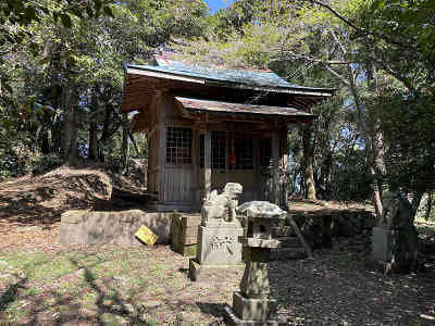 苔むす石段の右には自然石の巨岩が続き、とても豪快な風景である。石段を登り切れば右側が平坦になっており、この上には不動明王が祀られていた。かつての案内にはこの不動明王石像について、不動尊ともいう。一切の罪陣を打破し、どんな変事にもビクともしない不動の神である。右手に剣、左手に綱を持ち安産、除災等に効ありという。と書かれていた。今はこの案内の一部が不動明王の下に置かれていた。