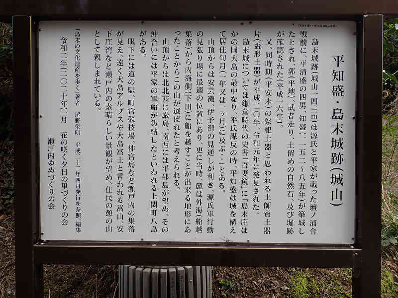 島末城跡東登山口へ着けば、入口に掲示されている平知盛・島末城跡(城山)の案内を眺めて登山を開始。「平知盛嶋末城」と書かれた幟が山頂へ導くように並んで立っている。