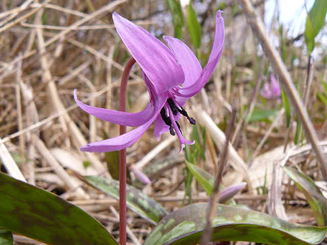 カタクリの花に夢中になる 周囲をよく観察するとカタクリ以外にもショウジョウバカマや白い花などが足下に咲いており、もうしばらく歩ける状況ではない。登山道に座り込みカタクリの花を観賞する。自然に咲くカタクリがこんなに美しいものだとは知らなかった。時を忘れてカタクリ鑑賞を続け、ようやくカタクリ群生地から出発する。