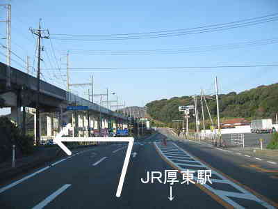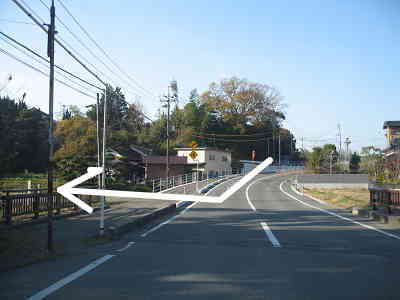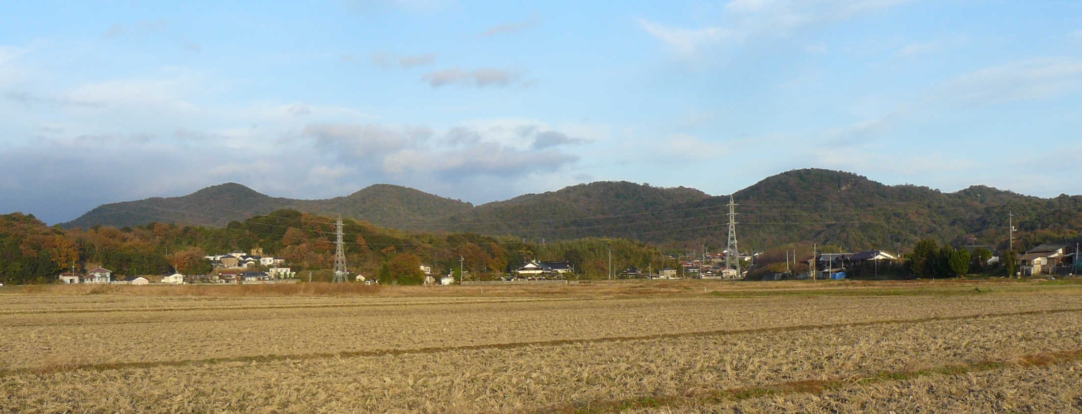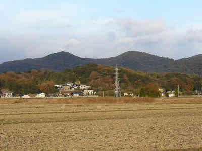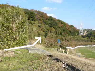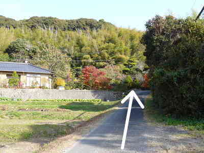 広福寺の前から北へ続く舗装道を道なりに進むと、北東から東方向へとゆるやかに進路が変わり、少し坂を登れば前方に耕作地が広がる。右からはあぜ道が続いており、ここで進路は北へ変わる。北東方向には出発地の携帯のアンテナが見えており、大回りしたことがよく分かる。