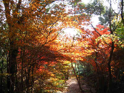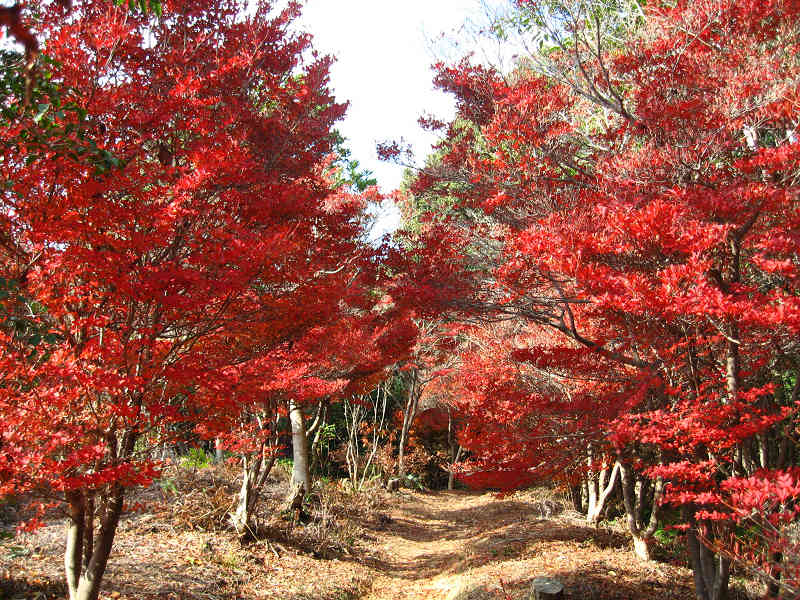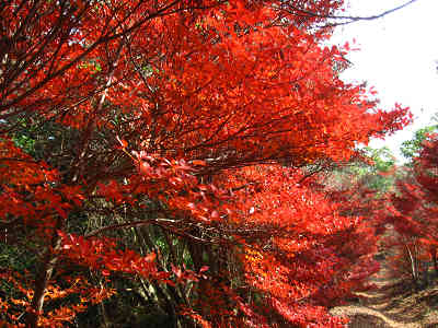 展望に満足し、少し進むと突然明るい広場に出る。ここはいったいどこだろうと周囲を見回すと、右方向に美しい紅葉が広がっている。これはドウダンツツジで、人工的に植えられたのだろうか、東へ向かって紅葉が続いている。こちらの方面への案内は無いけれど、馬の背上池へ続く分岐と思われる。