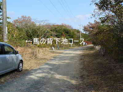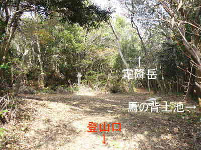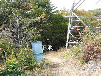 少しの坂を登れば風化した花崗岩質の大岩を過ごし、この先で登山道は左右に分岐する。右は「馬の背下池コース」と案内されており、駐車地のアンテナ付近から鉄塔の側を抜け、下池の側を通ってこの地に至るコースである。この方面へ少し散策をしてみると、すぐに下池の前に出る。広い池はとても穏やかな風情である。