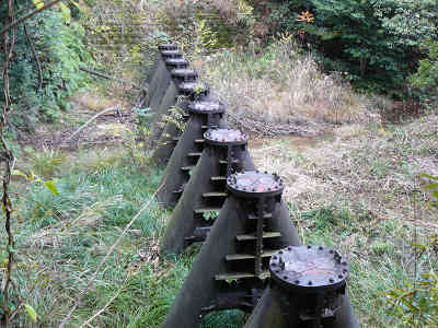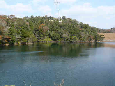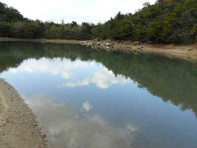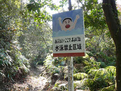 足下左に水路を見ながら北へ向かうと、左右に樹林が茂り始め、間もなく右下に鉄塔の巡視路を過ごす。更に進み、コンクリート橋を渡った後で壊れかけた石の橋を渡る。ここで進路は左に変わり、付近に沼でもあるのだろうか、水泳禁止区域の案内が置かれている。