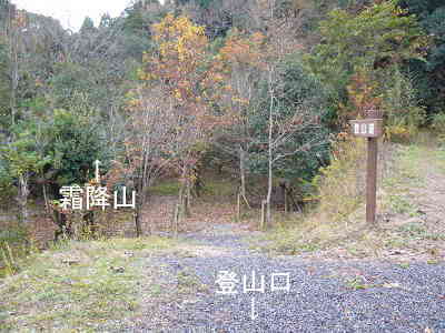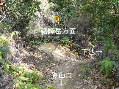 JR山陽本線の厚東駅を起点とすれば、駅前の交差点を左折する。国道2号を西へ1km程度進み、下岡交差点を左折すると、正面に霜降岳の勇姿が見えてくる。今回下山を予定する持世寺コース登山口へ、周回用のバイクを配置するため、下岡交差点から南西へ500m進み、持世寺温泉の案内に従い分岐を左折する。