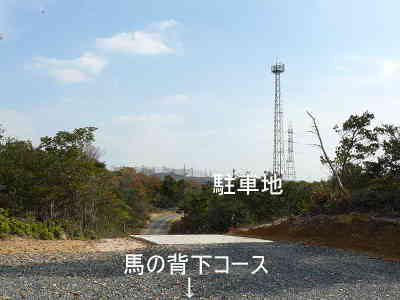 赤い警告灯の設置された分岐を左折、道なりにしばらく進み、左に携帯電話のアンテナが建っている付近に幅寄せをして駐車。側の電柱には「サイセキ23・NTT小羽山2 12」と書かれている。なお、この地点から鉄塔巡視路を西に入るとすぐに下池を経由して中山観音コースと合流する。もし効率的に登りたい方は、このコースを採ると良い。なお、私は一旦県道まで戻り、中山観音へ向かう約900mを準備運動がてら歩いた。