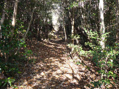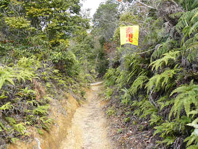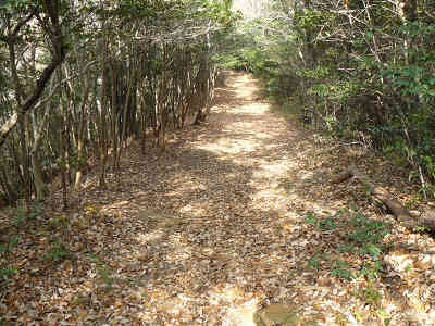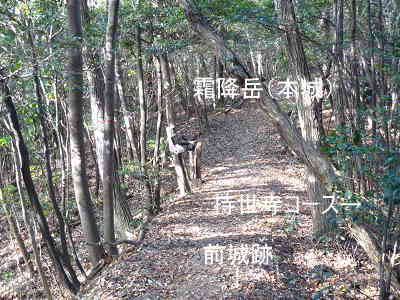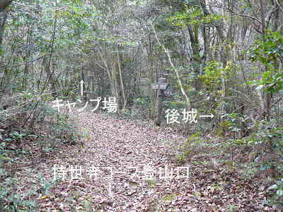 しばらく明るい前城でのんびり休憩を取った後、いよいよ山頂の本城へ向かって出発する。すぐに頭上は自然林に覆われるが、周囲は意外と明るい。この先少しの坂を下れば、鞍部で右に持世寺への分岐を過ごす。更に直進すれば、交差点へ着き、左は末信方面、右は後城と案内されている。ここでは本城へ向かって直進する。