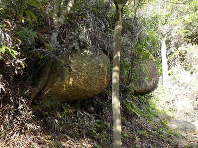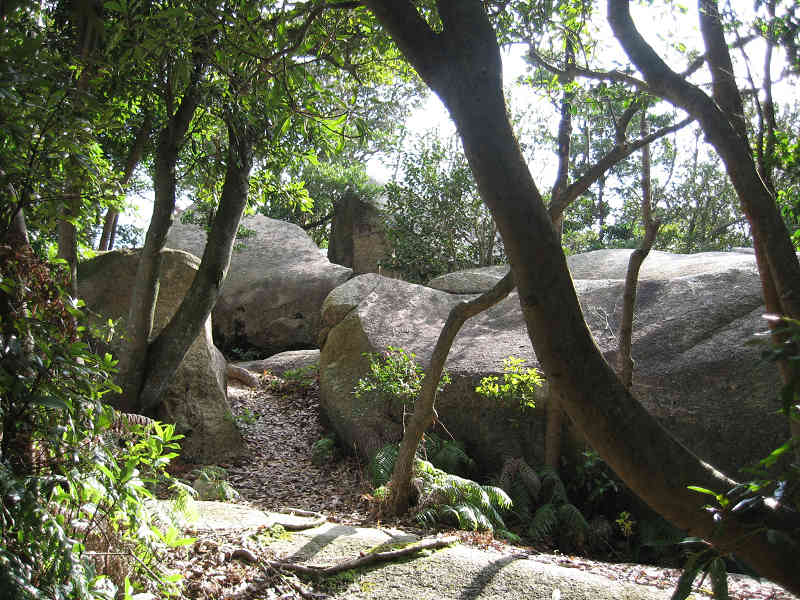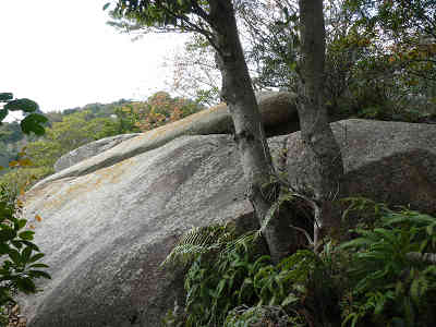 さて、元の分岐へ戻り登山を続ける。左下には池が見えており、この周辺には多くの池があるようだ。左右をシダに囲まれ、足下は彫られたような道となる。緩やかに高度を上げて行けば、周辺に松が増えてくる。特徴的な岩を観賞、背後を振り返れば宇部市の街並みが広がっている。