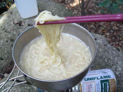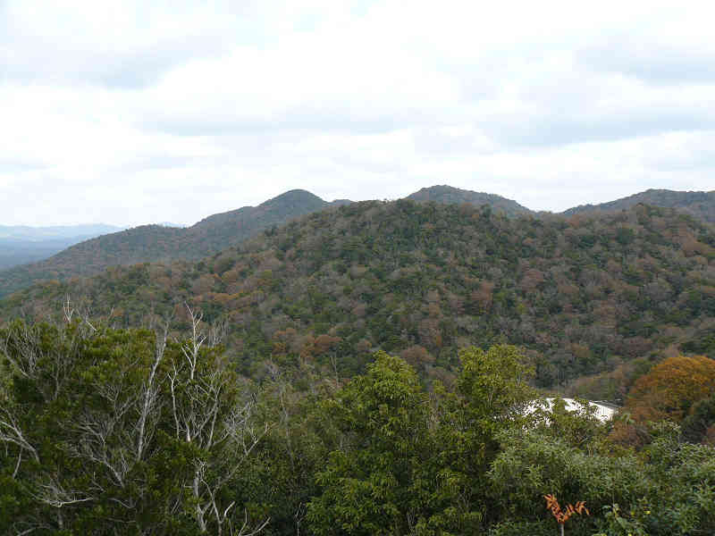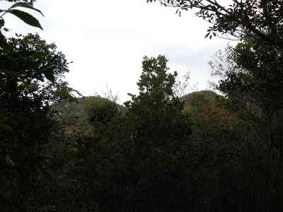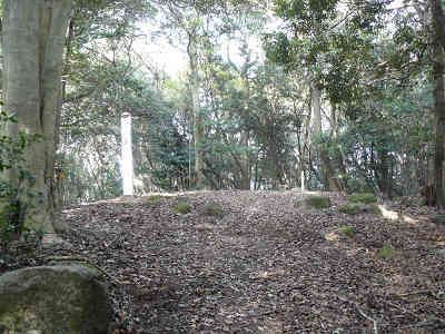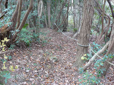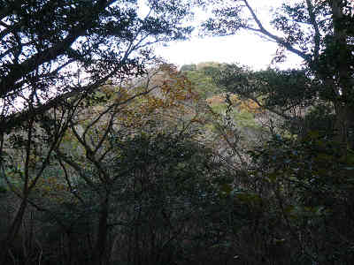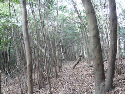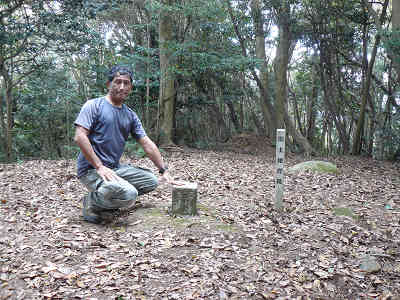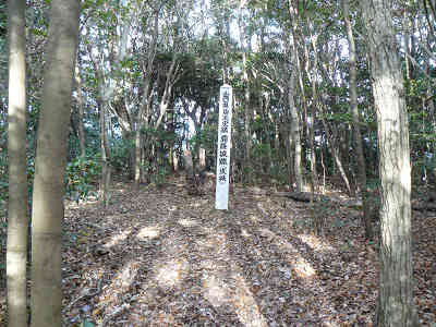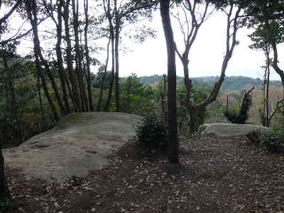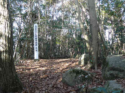 後城南峰の風景 これで後は持世寺コースへ向かって下るだけとなり、ここで昼食を摂る。本日はとても寒いので、新製法により作られた、麺のおいしい即席ラーメンを作り温まる。昼食後は持世寺へ向かって北東方面へ進路を採る。ところが2分も歩かないうちに再び後城の案内の立つ平坦地に着いた。結局後城は北峰、南峰の二峰に築かれていたようだ。