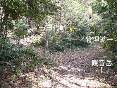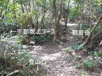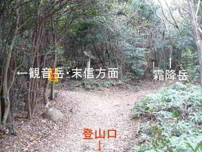 途中で馬の背遊歩道への分岐を右に過ごし、大岩のピークを通過して坂を下る。鞍部で左右の分岐を確認、観音岳へは右へ進路を採る。なお、左方向は宇部坂上コースである。左右にシダの茂る手作りの階段を登れば、大岩の目立つ観音岳へ到着する。岩の上からは目の前に田代峠、更に北には霜降岳、南東方面には市街地まで眺めることができる。