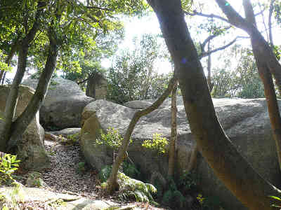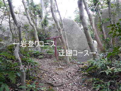 観音岳へ向かうには末信方面へわずかに進み、展望台・観音岳の案内に従いすぐに右折する。この先の登山道上には奇岩大岩が目立ち、とてもワイルドだ。展望岩の手前で登山道は左右に分岐し、左側は岩を登るコース、右は迂回路である。ここはワイルドに岩登りコースを採り、岩の上に立てば、宇部市の市街や工場群が広がり、美しい展望を満喫することができる。