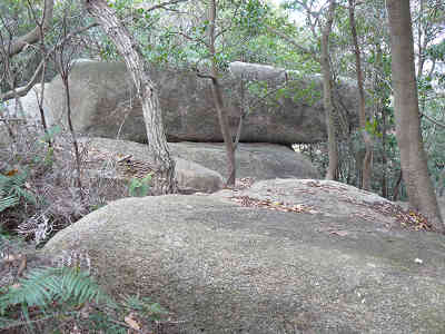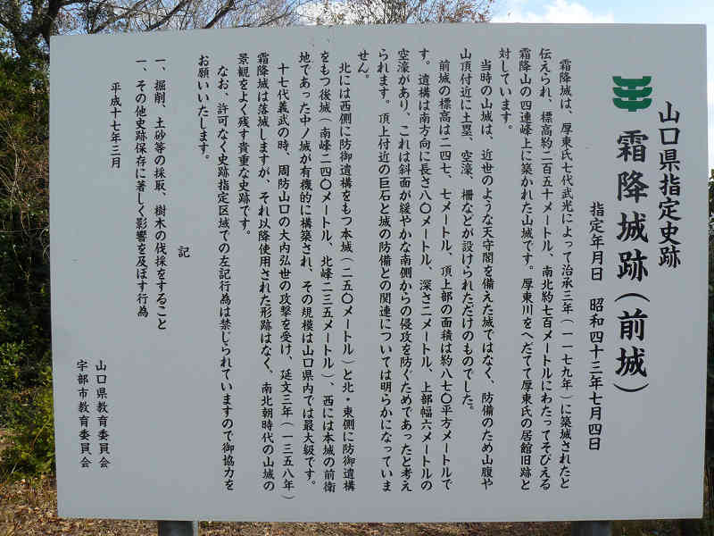 平坦な前城には、大きな霜降城跡(前城)の説明板が立ち、周囲を見回すと、立ち位置を変えながらも宇部の市街地と九州方面の展望を眺めることができる。展望広がる前城は、昼食を摂るのに丁度良い場所である。少し奥には自然岩の配置された場所もあり、この岩は腰掛けるのに丁度良い位置にある。 前城(説明は写真をクリック) 前城の風景