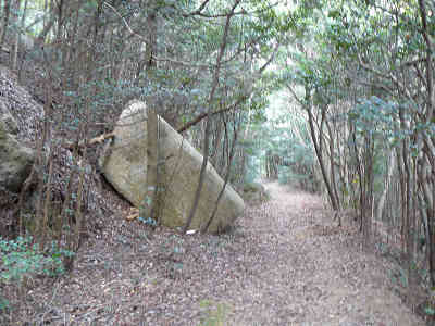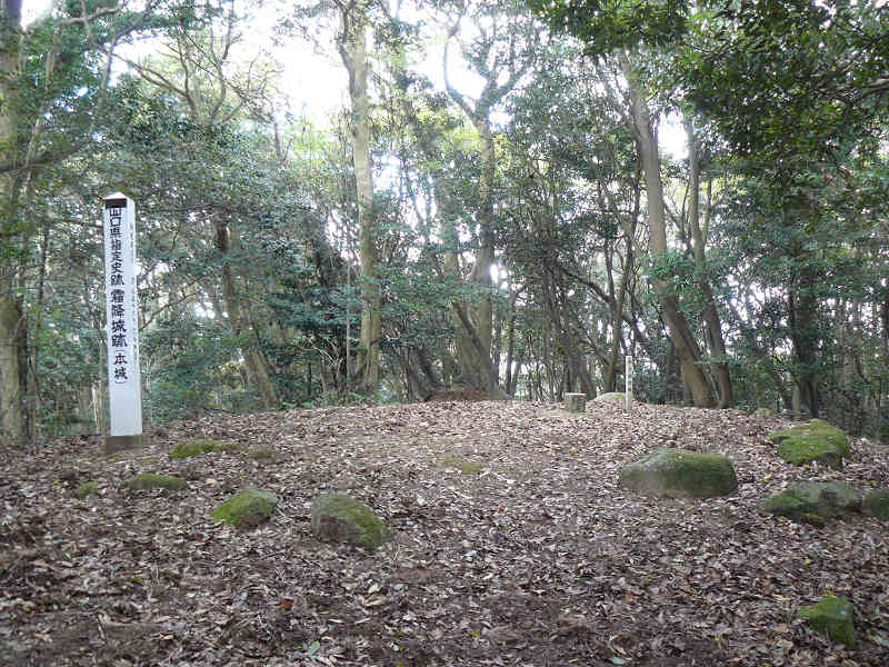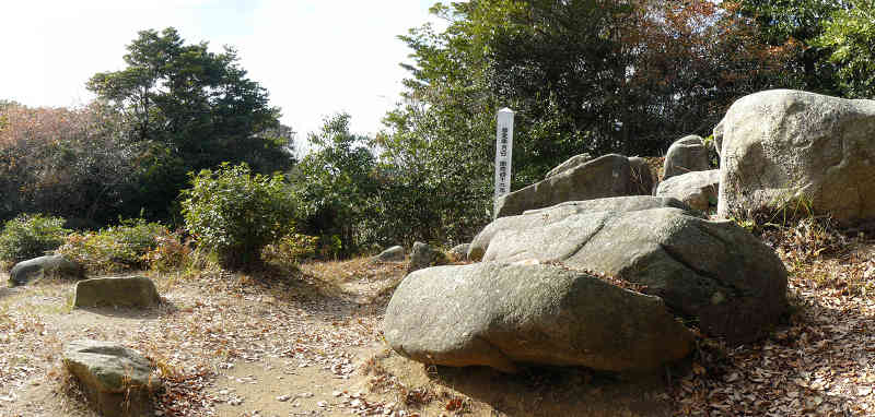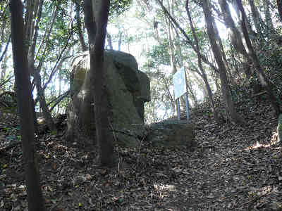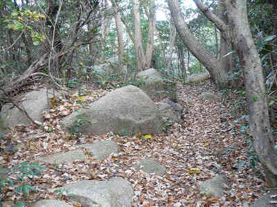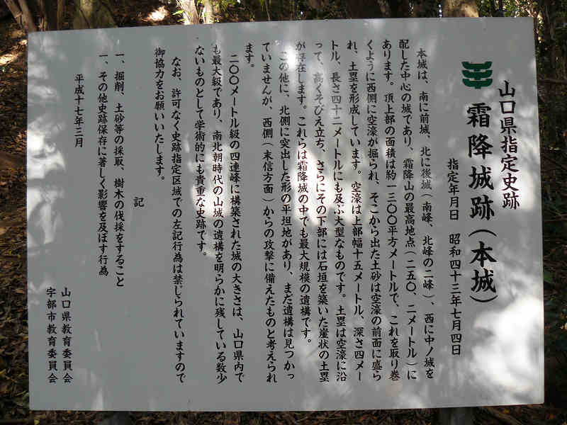 少し坂を登り、左に大岩を過ごせば、本城の説明板が置かれている。200メートル級の四連峰に構築された城の大きさは、山口県内でも最大級であり、南北朝時代の山城の遺構を明らかに残している数少ないものとして、学術的にも貴重な史跡と案内されている。さて、山頂の本城にはこの案内板の先を右折し、一段上の広場へ向かう。