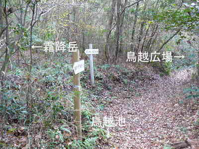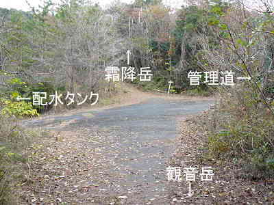 左に保健保安林の標柱を過ごし、快適な登山道を進む。左に大岩を過ごせば、突然舗装道を横切る。左には大きな配水タンクが見えており、これは先ほど観音岳から木の間越しに眺めていたものである。この分岐は管理道・霜降岳の案内に従い直進する。