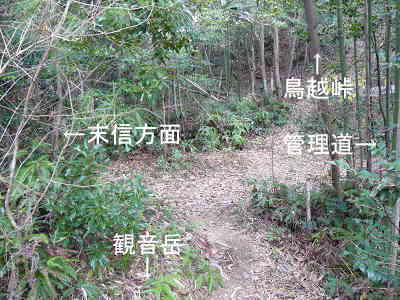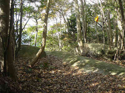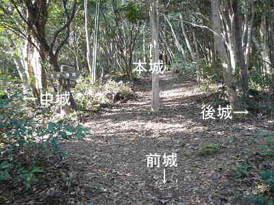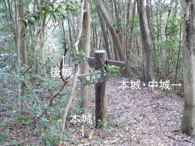 少しの坂を下れば左右の分岐へ到着、右は本城・前城・末延・方面への分岐へ向かっており、ここでは分岐を左折し後城へ向かう。頭上を覆っている樹林の切れ間からは、進行方向にちらちら後城の峰をかいま見る。坂を下って少し登り返せば後城の案内の立つ平坦なピークへ到着した。