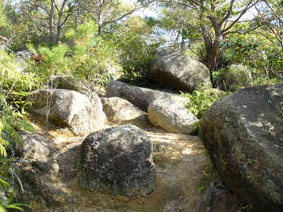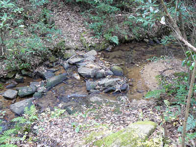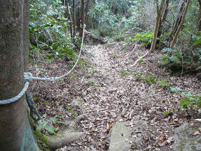 急な斜面に渡されたロープを使って下る やがて坂の傾斜は緩やかとなり、明確なる道に着けば、小さな沢を渡る。この沢を渡った先の歩道を左折すれば持世寺へ続き、右へ向かえばキャンプ場となる。この分岐は持世寺へ向かって左折、さわやかな沢の音を聞きながら北へ進路を採る。