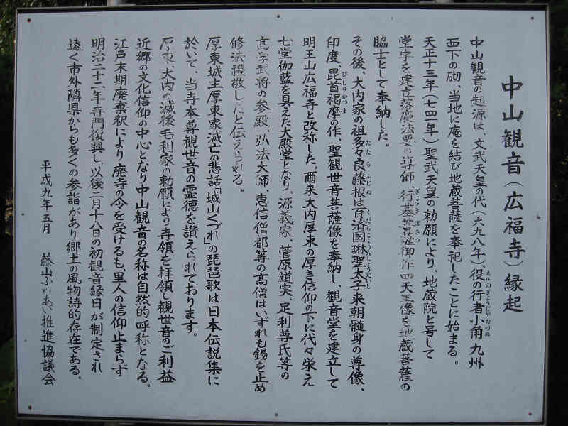 まず中山観音広福寺へ参拝する。中山観音(広福寺)縁起に寄れば、中山観音の起源は、役行者が地蔵菩薩を奉祀した事に始まったとされ、大内家の祖多々良藤根は聖観世音菩薩を奉納し、観音堂を建立して明王山広福寺と改称した。源義家、菅原道真、足利尊氏などの高学武将が参殿され、弘法大師、恵心僧都などの高僧はいずれも錫を止め、修法礼敬したと伝えられている。由緒ある広福寺に参拝し、霜降山へ向けて出発する。