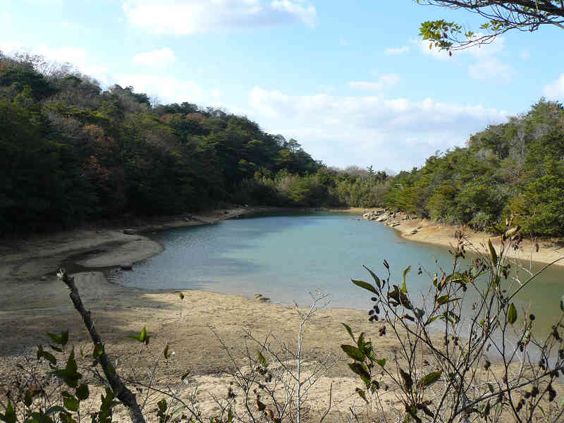 美しい木漏れ日を眺め、少しの坂を登れば、岩の目立つ鳥越峠を越える。峠から下る途中、木の間越しにこれから向かう前城方面が覗いている。シダの刈られた明確な踏み跡を下ると、すぐに水量の少ない鳥越池に着く。