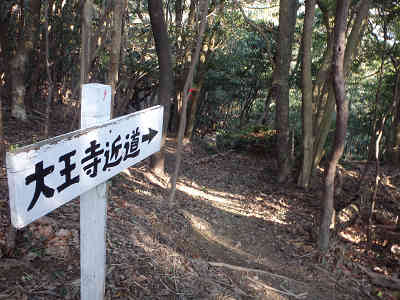 山城、曲輪跡を過ごし、下山は青山、大王寺方面へ続く急な坂を一気に下る。ただし、こちら側にも補助のロープが用意されているので、焦らずゆっくり下れば大丈夫。やがて大岩の前に出れば、この岩が天狗の岩屋で、この大岩の周囲はロッククライミングの練習場となっていた。 天狗の岩屋を出発、進路が右方向へ変われば坂の傾斜も緩やかとなり、間もなく大王寺への分岐が現れた。ここでは勝山展望所を確認するため、少し青山方面へ向かってみたが、勝山展望所は周囲の木々の背が高くなっており、勝山をすっきり見晴らすことはできなくなっていた。そこで途中から引き返し、大王寺へ向かって坂を下り始める。 坂の傾斜は大して感じることは無く、淡々と坂を下る。進路は赤テープなどの目印が続いているため、迷いそうな所はない。やがて周囲に沢の音が聞こえ始め、舗装路が見えてくれば未舗装の作業道へ出る。
