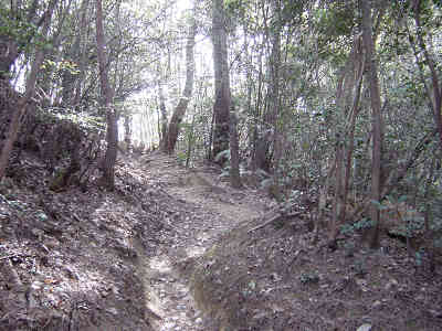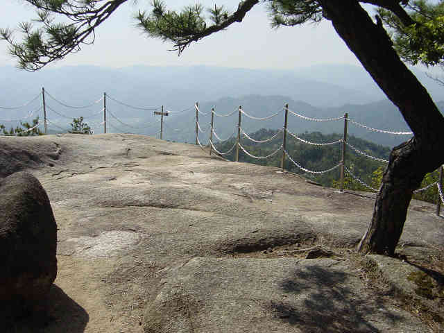 大岩の上に行き記念写真を撮った。そこから先には岩に根ざした木が多くあり、不思議な光景が続いた。突然に南東方向に視界が開け大きな岩が置いてあるような展望の岩となっていた。その下には平行に削ったような、側溝のような溝があった。