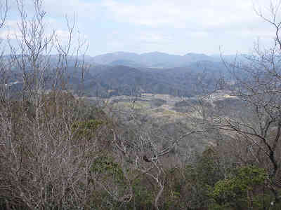 山頂にて小休止の後、先程の物見岩まで引き返し、周囲を眺めていると、少し下に四角い形をした岩を見つけた。そこでこの下へ向かうと、この付近は絶壁となっていた。勇気を出して岩上に立つと、眼下に広がる展望は、めまいがするほど素晴らしく、真下には耕作地、東から南へ向かって狗留孫山から大平山までの展望を楽しむことができた。 狗留孫山や大平山など(クリックで拡大) これで山頂付近での散策は無事終了、下山を開始する。接待岩の横を抜け、大岩の展望地を過ごせば水場の先に下山分岐が現れる。下山は引廻し方面と案内される方面へ向かってみる。こちらの方面にも奇岩大岩が多く配置され、一つ一つの名前は不明だが、大岩を鑑賞するのは楽しいものである。 コース途中にはロープも配置されており、このコースも良く踏まれているようだ。やがて大きなコウモリ岩の前を通過、この岩は大きすぎて写真に入りきらない。岩に数珠が掛けられたように見える数珠掛岩を鑑賞、白石公団造林地の古い標柱を過ごし、わずかに下れば最後に大きな狼岩を眺める。 そのまま道なりに進むと、すぐに左右の分岐へ着き、駐車場へ700mの案内に従い左折する。明るい作業道を進むと、間もなく右へ進路を採る。明確な道を道なりに進めば、峠を越えた先が白石山登山口の駐車場である。 白石山は接待岩まで広い遊歩道のような道が続き、高度を上げる感覚も無いので、疲れること無く山頂へ着くことができた。 徳地町から眺める白石山と狗留孫山(クリックで拡大)