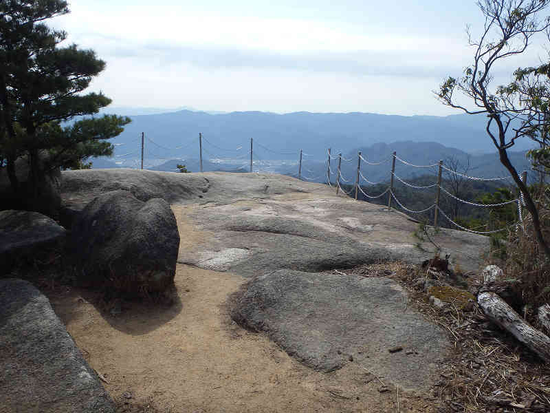 坂の傾斜を感じながら木の根の張り出す道を辿る。左右に自然林を眺めながら更に進むと、突然広く平坦な場所に出る。山頂へは右へ向かうが、左に展望広がる物見岩があるので立ち寄る。物見岩の上には平坦な展望地があり、東から南、西へと絶景が広がっている。 西に蕎麦ヶ岳、左に真田ヶ岳と続き、南には矢筈ヶ岳とアンテナの建つ大平山、南東に四熊ヶ岳に嶽山、東に向かって千石岳、要害山、狗留孫山、その先にアンテナの建つ石ヶ岳と、本日はいつもに比べて少し霞が取れており、展望を楽しむことができる。