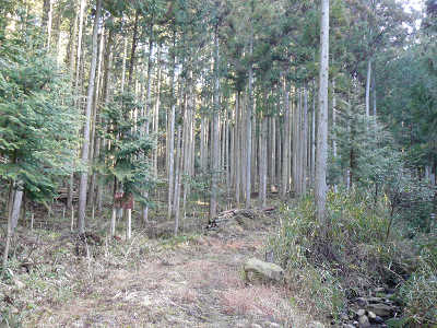 前方に突然笹の茂る場所が現れるが、少し進めば笹藪は消え、再び足下に杉枝などの目立つ道に戻る。やがて広い林道終点へ到着、右に堰堤を確認する。そのまま奥へ続く谷に入るが、周囲には倒木が目立つ。