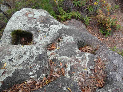 あざらし岩の案内を見て東側の岩を眺めるがよく分からない。頭の部分の木が大きくなってあざらしの一部が見えなくなってしまったのかも知れない。真砂の道を進みこの先で風化した花崗岩の道を過ごせば頂上まで100mの案内を通過。山頂手前で旗立岩を眺める。岩の2ヶ所が四角に掘られておりこの岩は加工しやすいのだろう。