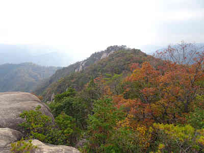 ここまで来れば大師山まではわずかな距離で、すぐに山頂手前のうさぎ岩に着き、北に広がる展望と合わせて三倉岳を眺める。ただし展望は霞んでいた。大師山へ向って急登の大岩へ向かい、ロープを補助に高度を上げる。すぐに大師山の山頂に到着、岩上から周囲に広がる展望を眺める。